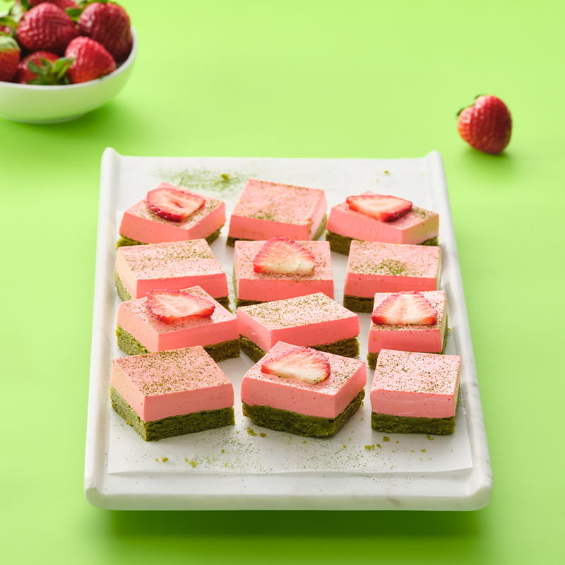 - 5 Once set, carefully remove slice from pan and gently sift extra matcha powder over the top. Decorate with strawberries (if using). Use a slightly warmed knife to slice into 16 even squares. Keep refrigerated in an air-tight container for up to 1 week.