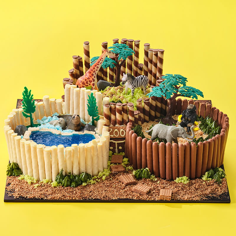 5. Position Safari trees at the back of the cake and decorate with an elephant and an ape devouring a banana lolly. For the safari enclosure border, spread frosting over flat edge of milk chocolate finger biscuits and press firmly around the edge of the cake.